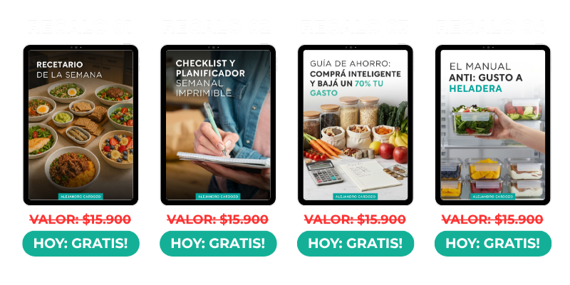 Porque este ebook te enseña un método completo y probado, no solo recetas sueltas. Aprendés a planificar tu semana, optimizar tus compras, reducir desperdicios y comer sano sin pasar horas en la cocina. Además, incluye 16 bonus con contenido exclusivo que no vas a encontrar en internet.