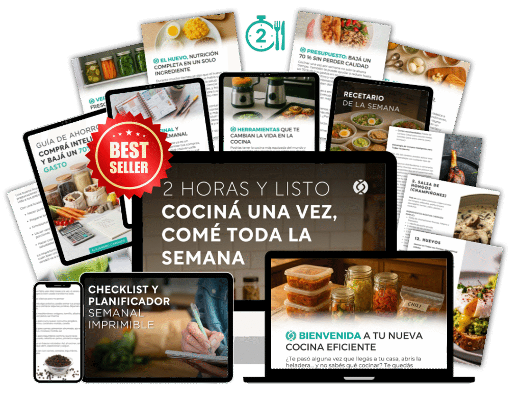Vas a recibir un ebook digital en formato PDF, que llega directo a tu correo apenas confirmás el pago. Incluye un método paso a paso para cocinar en menos de 3 horas y resolver todas tus comidas de la semana, con recetas saludables sin azúcar ni harinas refinadas. Además, vas a recibir 10 bonus digitales gratis con menús completos, guías de conservación, recetas dulces, saladas y más.